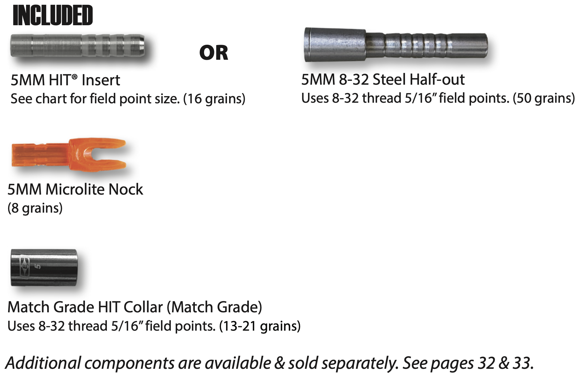 - 5MM HIT 8-32 inserts or NEW 50 grain steel one-piece half-out options
